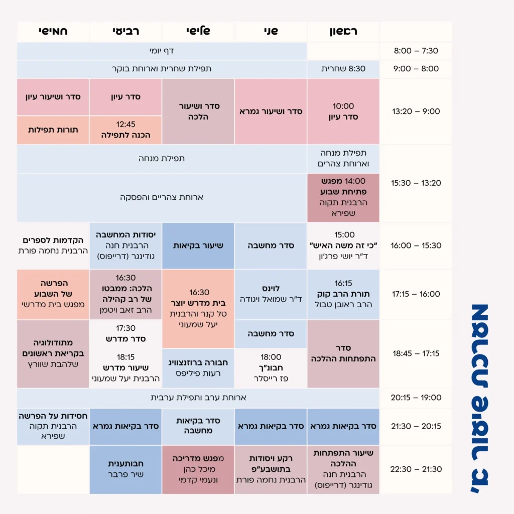 אנו רואות בגמרא את עמוד התווך המרכזי בלימוד ובהתפתחות בעולם התורה. לצד לימוד עצמאי בחברותות ושיעורי עיון משותפים, כל לומדת מקבלת ליווי אישי ממוקד כדי לפתח את מיומנויות הלמידה שלה, ולהבטיח שלא משנה עם איזה רקע וניסיון היא יוצאת לדרך – היא תוכל להתקדם בלמידה ולהצליח.